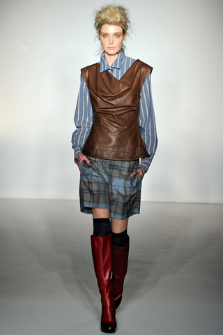As a bonus, this collection is a study in my favorite color scheme. A teal undershirt peeping from under a coral dress; ice-blue tartan trousers worn with burgundy boots and belt, and a soft camel coat to tie it all together; the shimmering, cascading lilac dress; the beige knit ensemble i could live in; the perfect yet stubbornly asymmetrical black velvet blazer worn with a jabot shirt and - oh Vivienne - torn skinny jeans; and possibly the look I'd most like to own: the gray sweat-suit style two-piece worn with a laid-back chambray shirt.